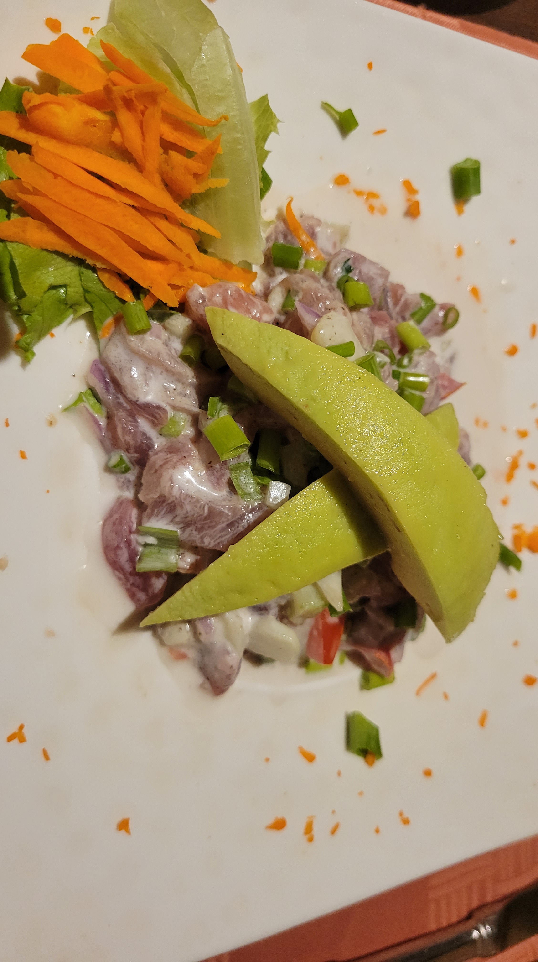 Our first order is a local favorite, poisson cru. An incredibly delicious mix of raw tuna marinated in lime juice, fresh coconut milk, tomatoes, onions, cucumbers, ginger, and carrots.