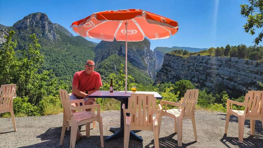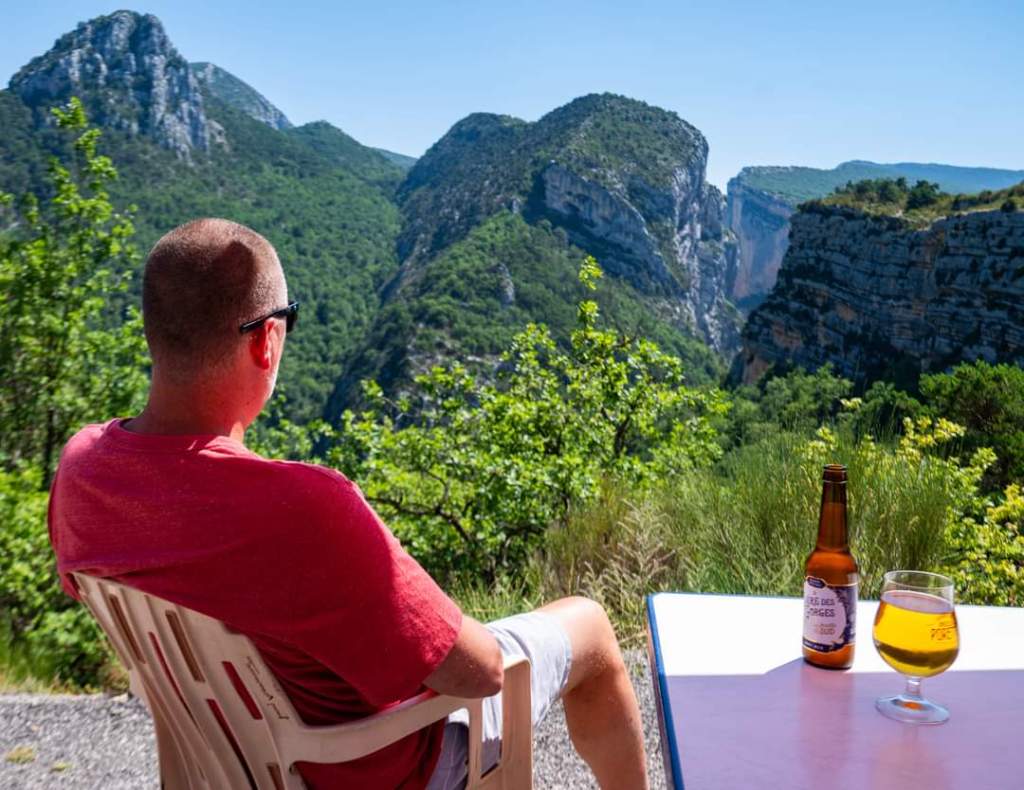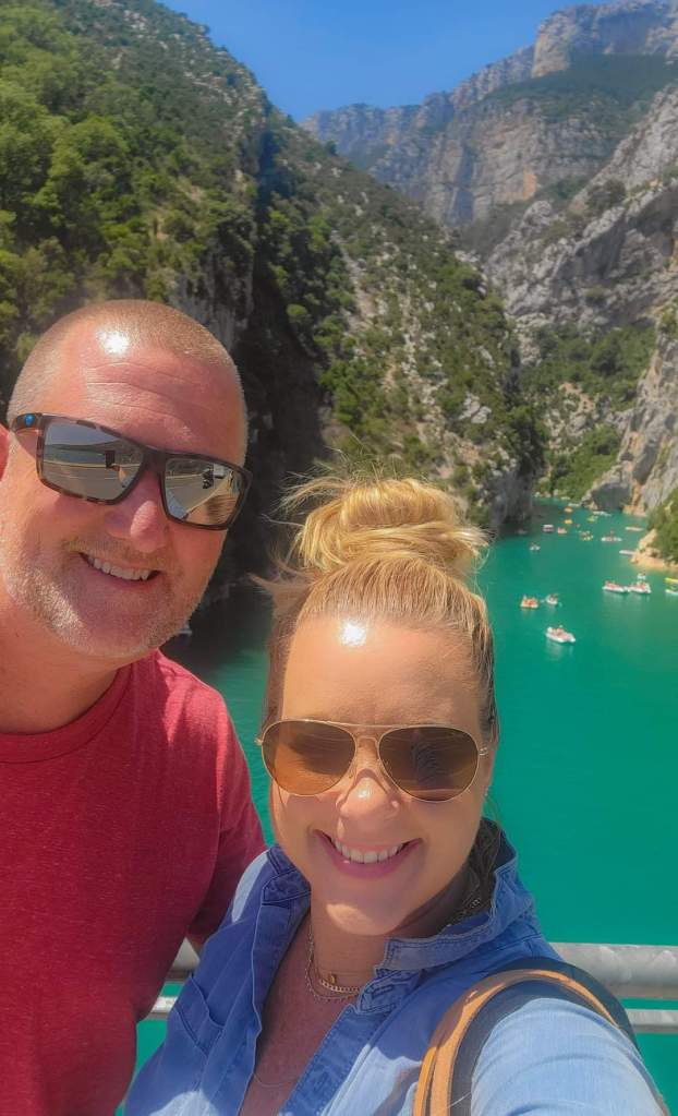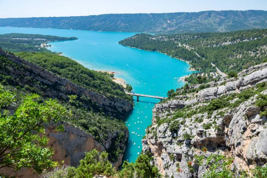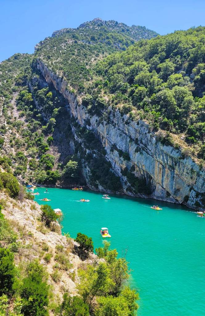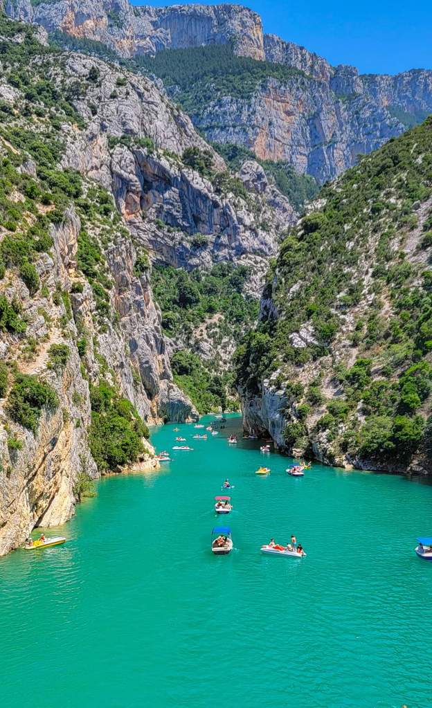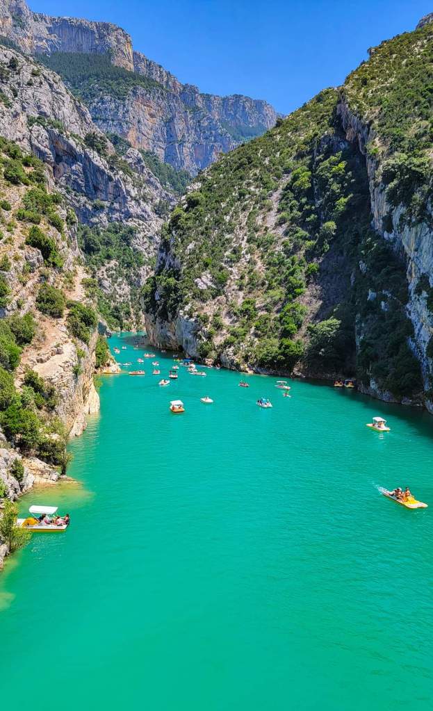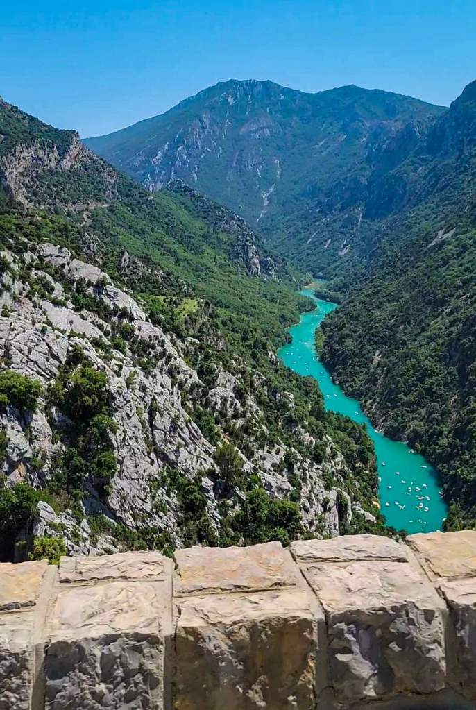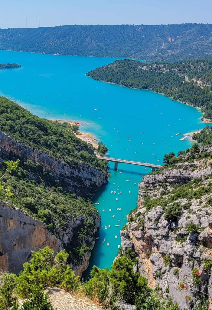 Finally, we are on the move to Verdon Gorge. Just past Moustiers, we arrive. We stop at the bridge for some drone shots and incredible views of the limestone cliffs and blue water!