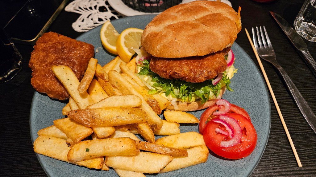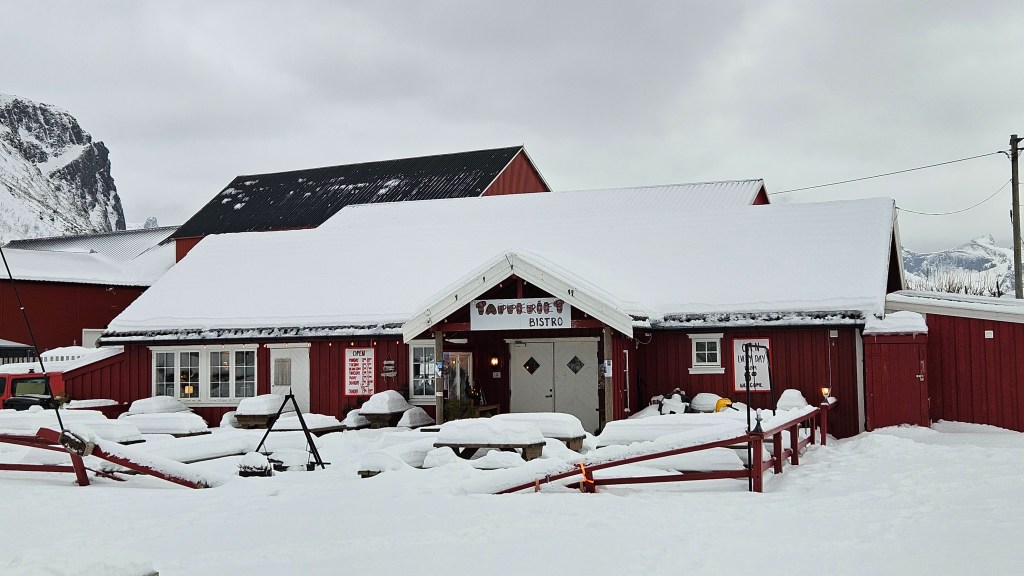 Hungry, and with not many options since it is the heart of winter, we head back to Reine for some more fish & chips, and a fish & chips sandwich. Solid choice (again)! Important to note, this time of year, not much is open and the roads are tough to navigate. Partly why we ended back up at the same restaurant, but also because we really enjoyed the local food and ambience of this particular restaurant.