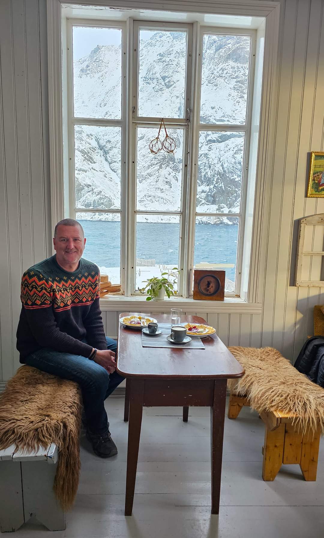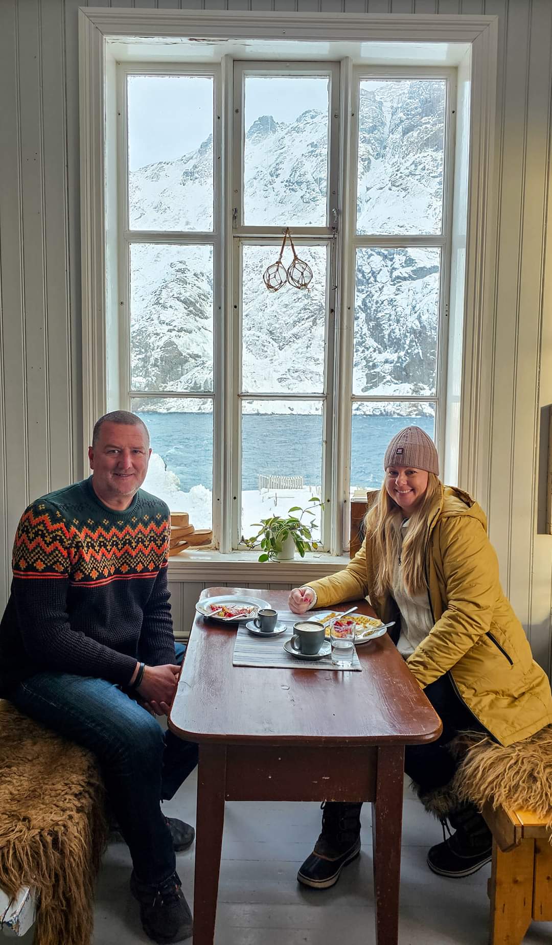 For today’s scenic adventure, we drive north to the small fishing village of Nusfjord, with a population of 28, yup 28! Nusfjord dates back to 425 BC, one of the oldest fishing villages in all of Norway. We settle in at the Landhandleriet Cafe to enjoy a variety of pastries and expresso.